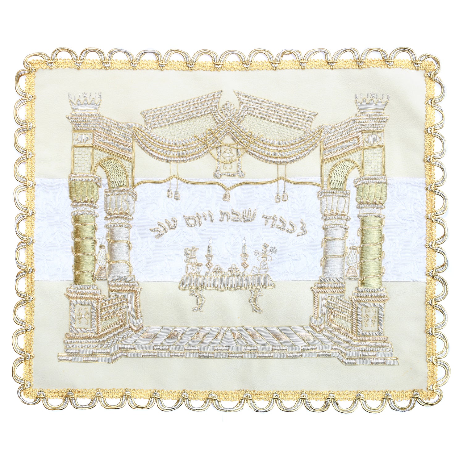 Challah Cover Hand Embroidered White Brocade & Suede Gold Medium 18x21"