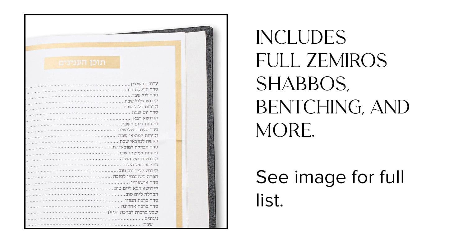 Includes: Waterdale notes what’s included: Finally! A magnificent set of 6 modern Pleather Hardcover Books that include every single thing for the Shabbos & Yom Tov Meal. It includes Shabbos Zemiros! (Nusach Ashkenaz includes Sefard within).