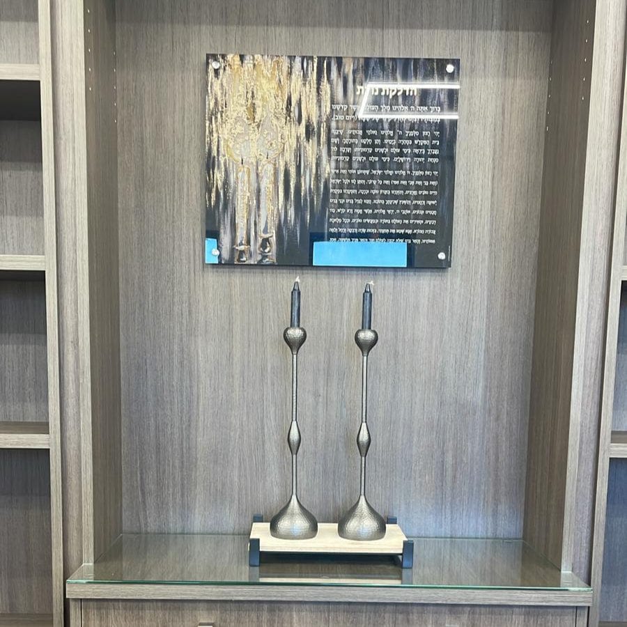 Painted Black Candles Hadlokas Neiros Wall Art is a wall art piece in Lucite, made to live for a Jewish home, entryway, or office wall from Waterdale’s Painted collection.