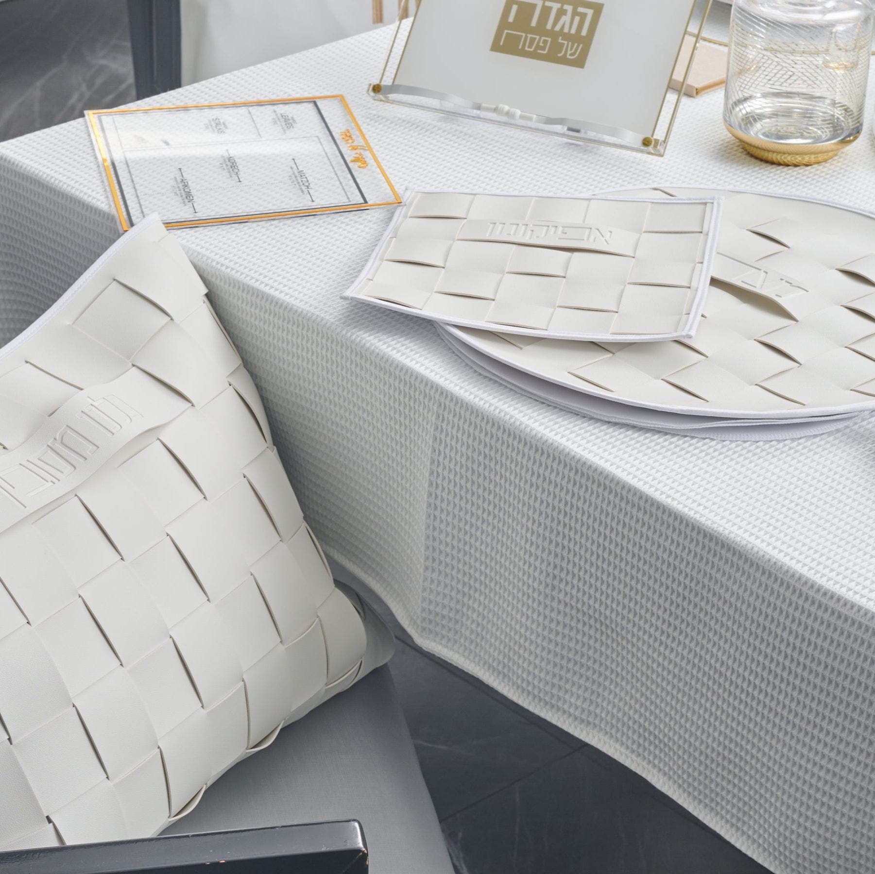 Shop This Tablescape individually above, or shop the entire look for 4 and save over $100. Entire Tablescape includes: 1 Woven Leather Pesach set 4 Leather...